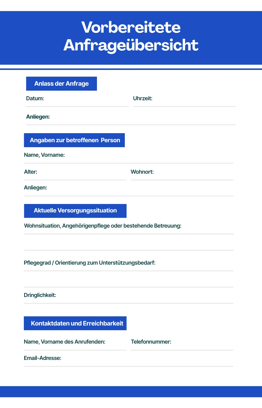 Erfasste Anfragen werden automatisch als strukturierte Anfrageübersicht per E-Mail an Ihre Einrichtung übermittelt und können direkt weiterbearbeitet werden.